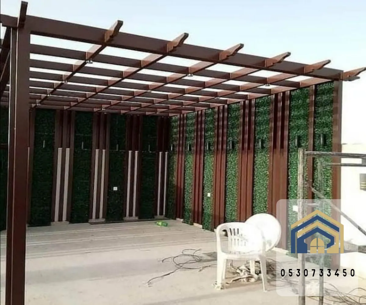 • برجولات بلاستيكية (WPC): عصرية وعملية، مقاومة للماء والرطوبة ولا تحتاج صيانة دورية
